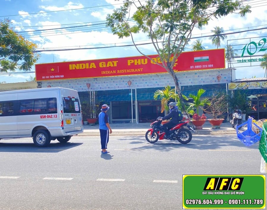 Nhà hàng INDIA GAT PHU QUOC nằm trên trục đường lớn tại Phú Quốc. Bảng hiệu nổi bật với nền đỏ và chữ vàng bắt mắt. Thiết kế mang đậm phong cách văn hóa Ấn Độ. Khách đi đường dễ dàng nhận diện thương hiệu từ xa. Bảng hiệu sử dụng chất liệu alu cao…