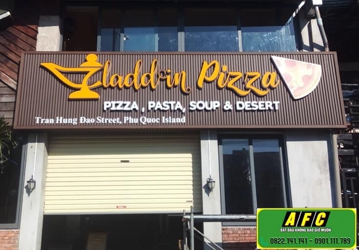 Mẫu bảng hiệu alu chữ nổi mica hoặc bảng hiệu alu chữ alu, chữ nổi inox được trang trí gắn trên một mặt dựng bằng alu hoặc bằng tôn. Bảng hiệu được cố định bởi các khung sắt vuông và tấm alu gắn trên khung sắt vuông làm bảng hiệu, sau đó trang trí các dạng chữ nổi bằng mica hoặc alu, inox để trang trí.